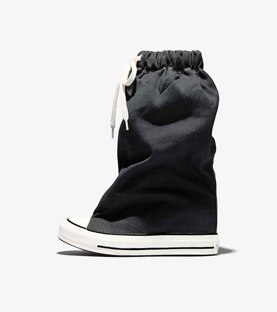 A collision of icons brings the rebellious spirit of Vaquera and Cortisa Star to Converse style. A knee high waxed canvas upper and Chelsea wedge insole give the All Star look a provocative new stance—a little baggy and oversized with a top lace and elastic webbing for style versatility. Lace up a bold new statement piece with the Chuck Taylor All Star XXXHi Slouch Wedge from Vaquera.