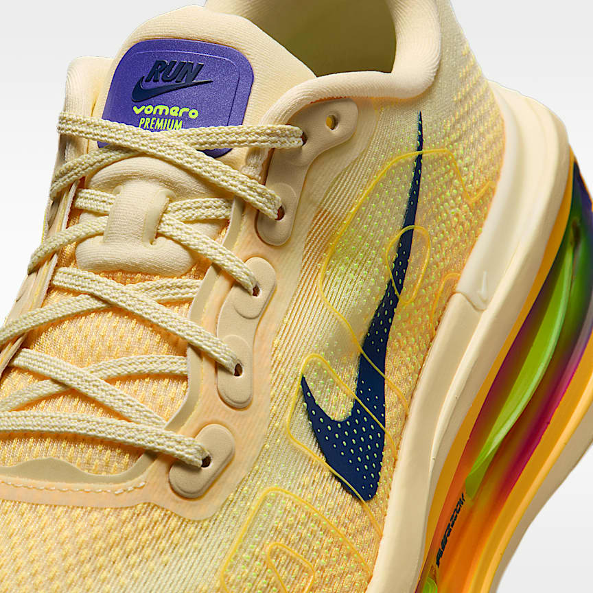 Maximum cushioning and dual Air Zoom units deliver an ultrasoft ride. Take maximum cushioning to the extreme in the Vomero Premium. Two energy boosting Air Zoom units are surrounded by ultrasoft, responsive ZoomX foam to give you our most comfortable ride yet for everyday road runs. Breathable Upper Engineered mesh upper is breathable, lightweight and soft. ZoomX Foam Midsole Our full-length ZoomX midsole is made of Nike’s lightest and most responsive cushioning for a comfortable ride. Double Air Zoom Two Air Zoom units, one at the forefoot and one at the heel, boosts energy return. Durable Traction Our durable Waffle outsole with high-abrasion rubber provides all the traction you need. Product Details Weight: Approx. 351g/12.4 oz (Men’s US 10) Heel-to-toe drop: 10 mm