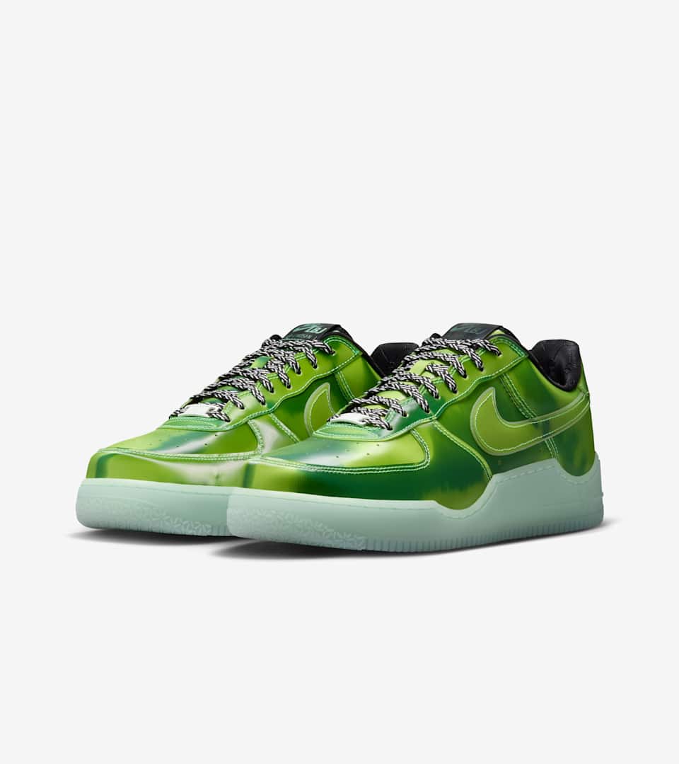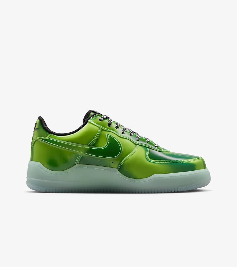 To celebrate LeBron's LA connection we designed this AF1 with the most magic of Hollywood items in mind: The green screen. The lenticular upper shifts as you move while the glow-in-the-dark sole and Swoosh outline adds some illuminating contrast. Inside the bold shoe is a sockliner featuring a crown for King James seen through the lens of special effects. The AIR logo is replaced with the GOAT icon, but don't worry—the shoe still comes equipped with a drop-in foam midsole and Zoom Air in the heel for incredible comfort.