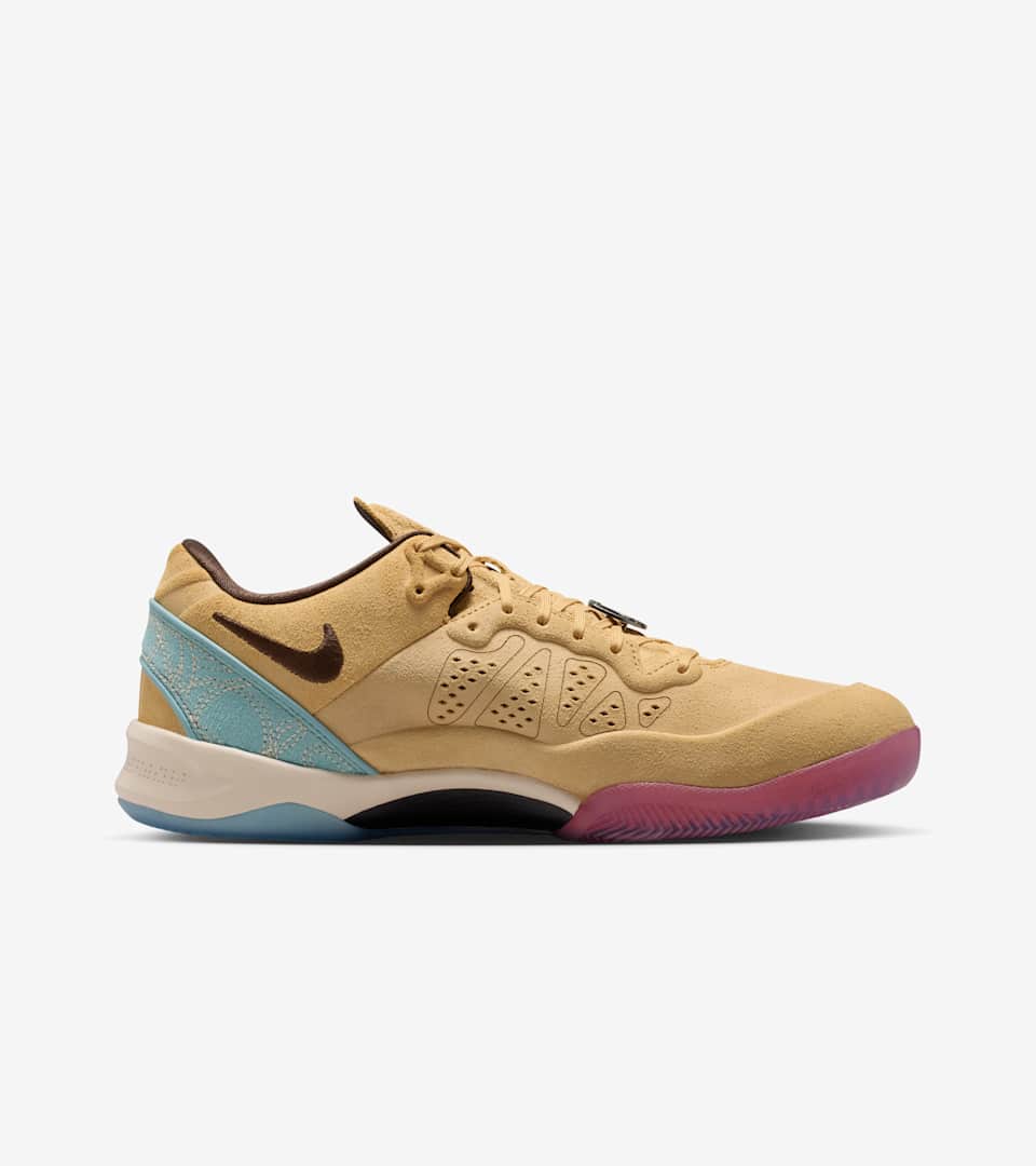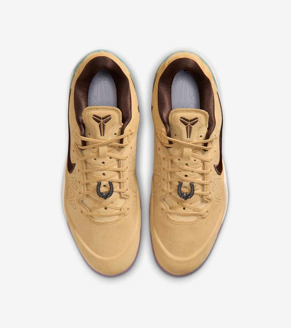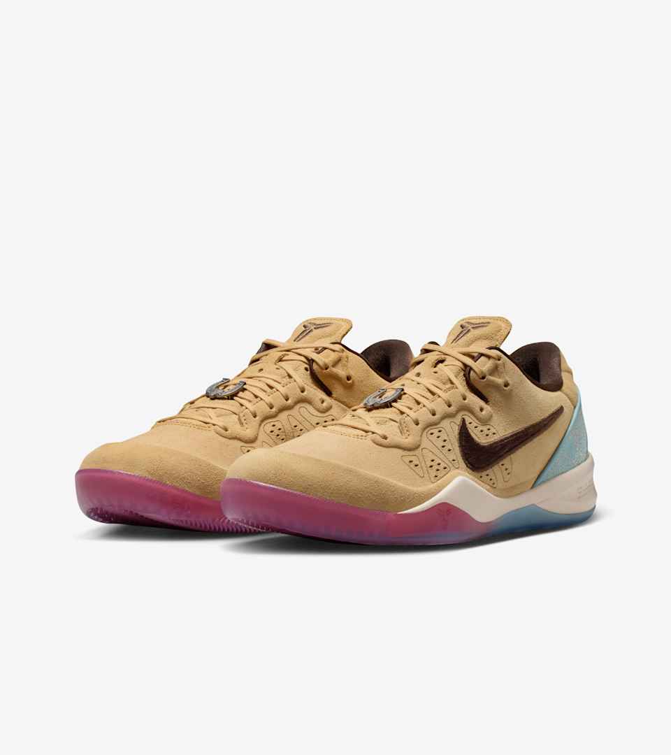 This Kobe 8 Protro pays homage to an unbreakable brotherhood and a race horse that united them in 2012. The Twine leather upper is highlighted with pony hair details in Baroque Brown, and foxing in Ocean Cube ties the upper to the icy ombre outsole. Special horseshoe dubraes complete the story, featuring a Kobe sheath surrounded by the phrase "Siempre Hermanos."