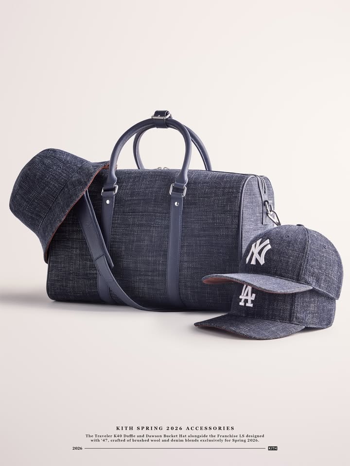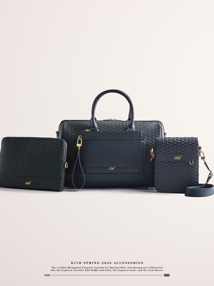 This week’s Monday Program serves as a preview of our accessories offering from our upcoming Spring 2026 Collection. The assortment expands our leather goods offering as we debut two new bag silhouettes — the Explorer Pack and the Messenger Briefcase alongside the return of the K40 Duffle. The offering is completed with a range of laptop sleeves created in multiple sizes and debuts our new Vachetta Belts. Each silhouette is updated with all-new Kith Monogram artwork. This offering also includes a range of staple headwear in partnership with ’47 including the Franchise LS and with New Era on its 59FIFTY Low Profile Fitted and Bay Low Pinch Crown, each designed in fabrics that corresponds with our larger collection as well as an offering of our Nolan and Aaron Caps. The collection is completed by a range of other accessories including Racer Sunglasses, Bandanas and a range of our classic socks.