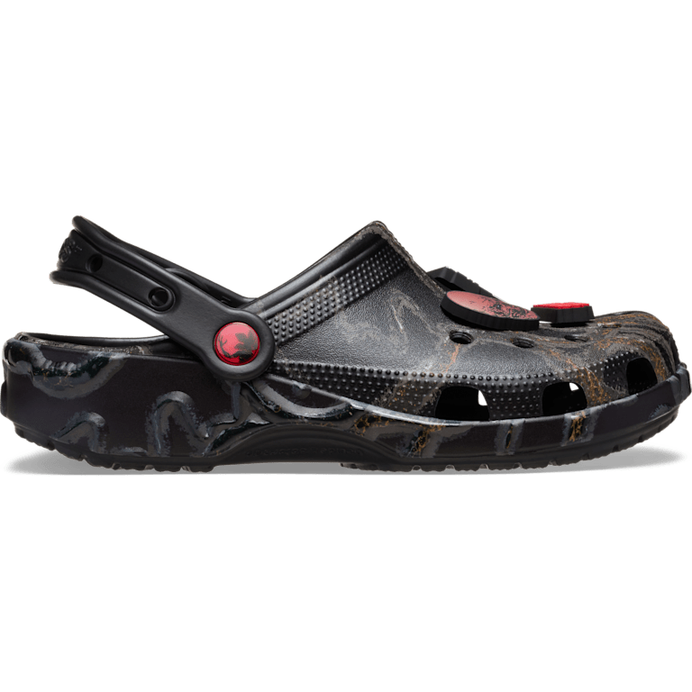The Upside Down has transformed the Classic Clog. This sentient-like silhouette features spectral Mind Flayer graphics that wrap themselves over the upper and around the heel bringing this dark being to life. A collection of six Jibbitz™ charms including a 3D Demogorgon face, flashlight, walkie talkie, Vecna's face, and more sit on top next to plenty of room to add more of your favorite charms. Prepare to enter a parallel dimension in this haunting pair.