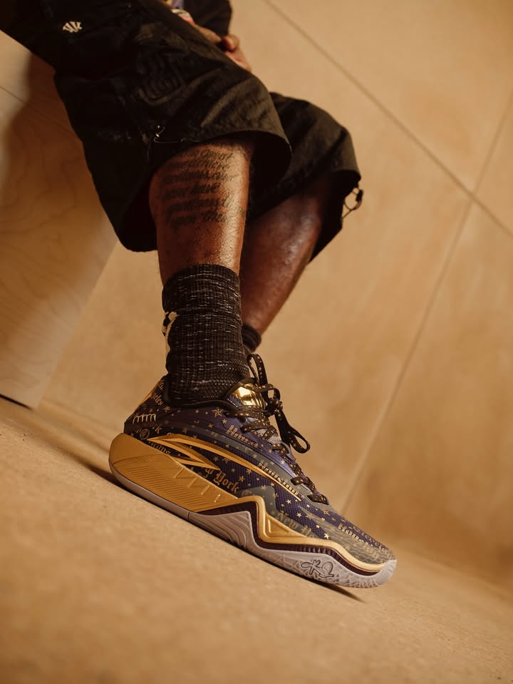 The ANTA Kai 3 “Kai Mentality” is draped in purple & gold, honoring Kyrie’s mentor Kobe Bryant and the mentality he instilled in his pupil. Inlaid in the design are city names representing the location of each of Kyrie’s 9 All-Star appearances.