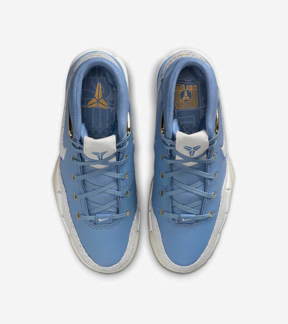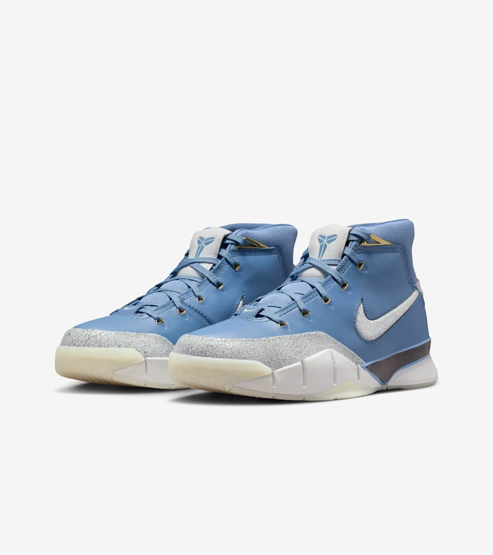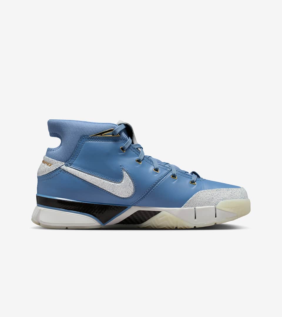 The premium leather upper is rendered in Summit White and Work Blue, paying homage to Kobe's fabulous first home court in Inglewood. Metallic Gold details make a winning combination. Retooled for the modern game, the Kobe 1 Protro features a smaller carbon fiber shank compared to the original, along with a full-length Zoom Air unit, resulting in a smooth ride and continuous responsiveness on court.