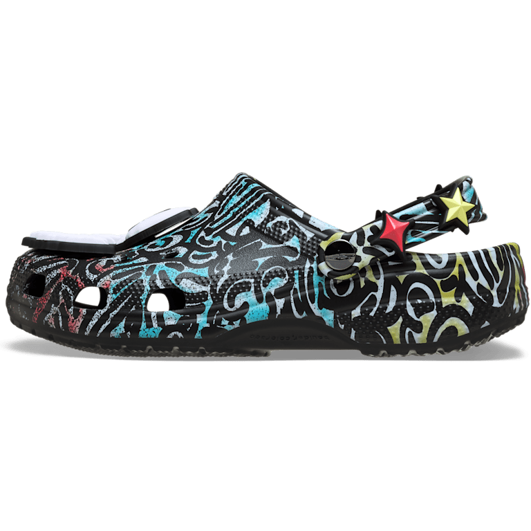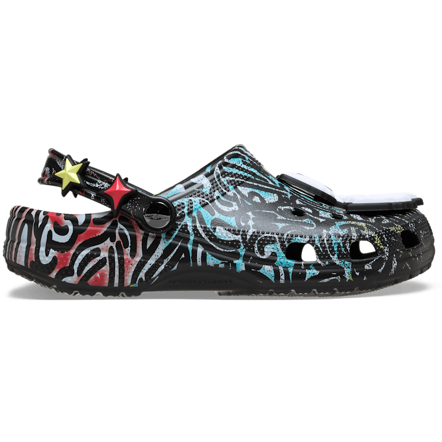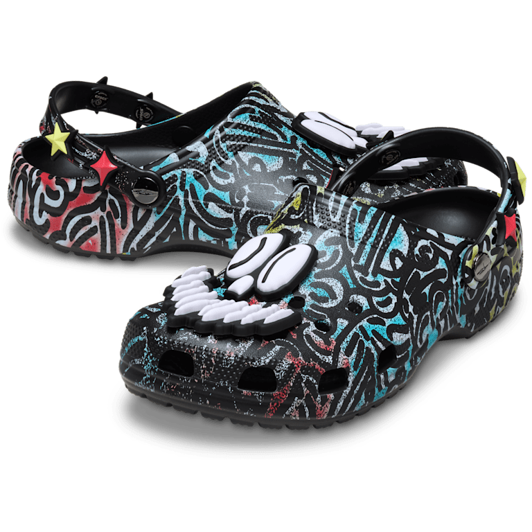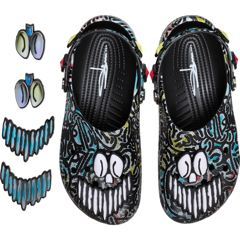 Don't call it art, and don't call him an artist. The Slawn x Crocs Classic Clog and its mesmerizing graphics are the brainchild of Olaolu Slawn, a Nigerian designer and artist. The shoe's striking designs are inspired by Slawn's ubiquitous caricature spray paint pop art that appears on everything from traditional canvases to vehicles, apparel, and accessories. Emerging from the upper are eyes and mouth Jibbitz™ charms that can be swapped out with a second colorful set.