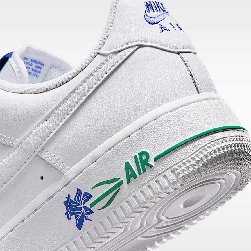 Understated elegance delivers big with this AF1. Real and synthetic leather combines for a textured and monochromatic backdrop that let's subtle floral details elevate the classic silhouette. Benefits Nike Air unit provides lightweight cushioning. Rubber outsole with classic pivot circles delivers traction and durability.