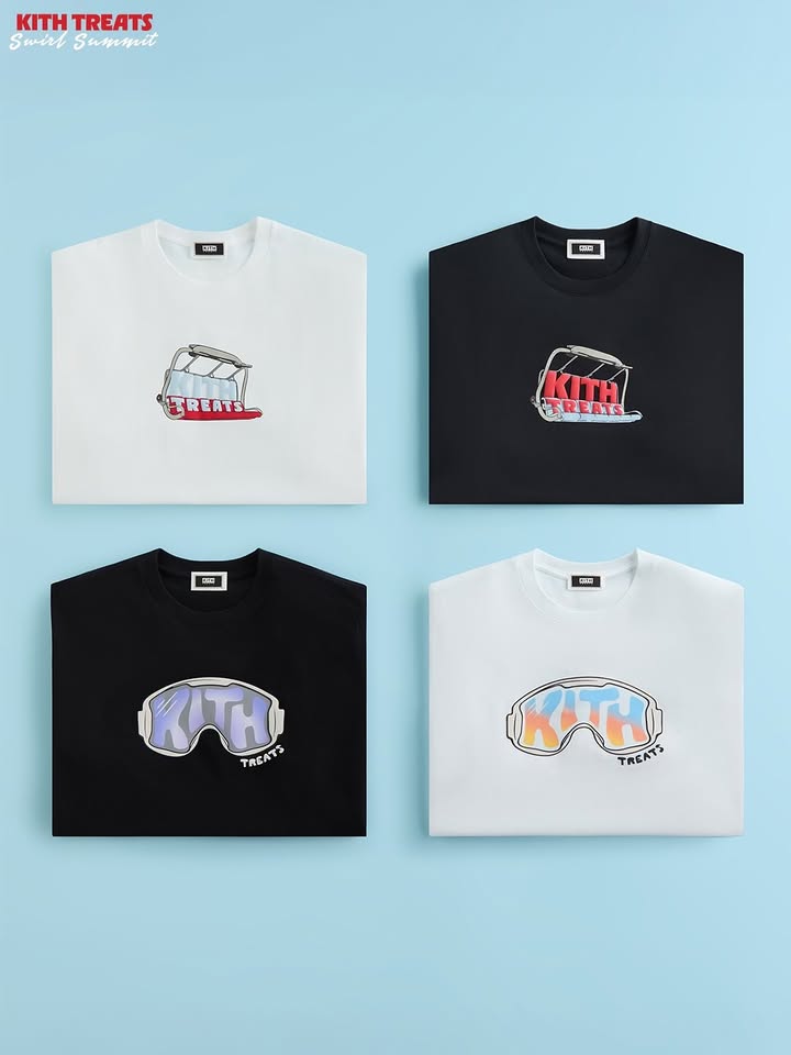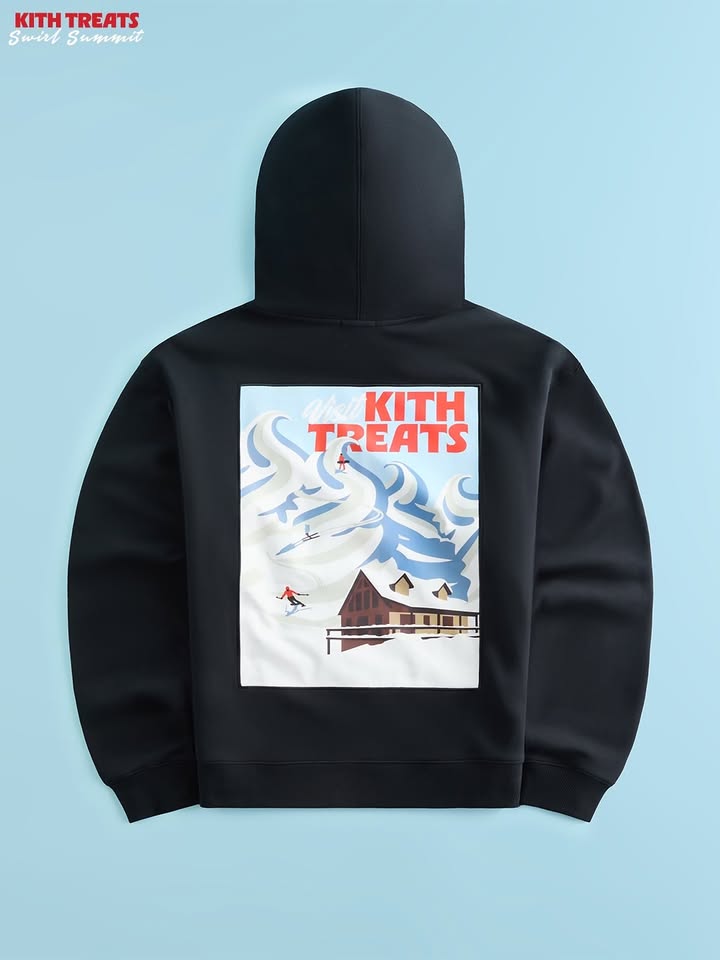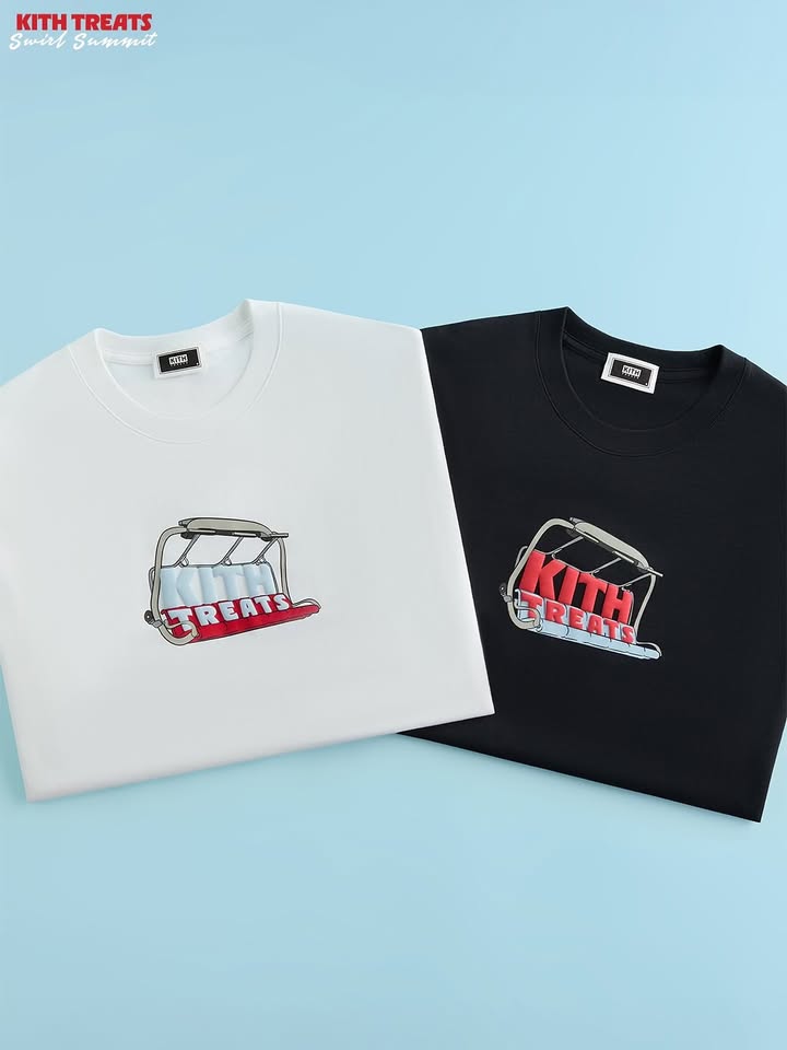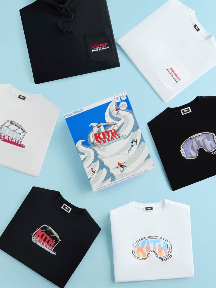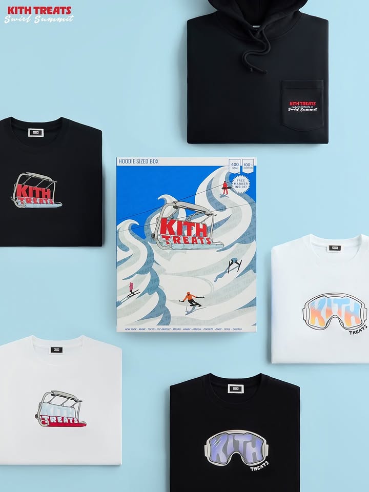 Treats Swirl Summit. A collection of seasonal graphics that celebrate the spirit of the slopes. This six-piece capsule evokes winter getaways and alpine adventures across a range of Kith’s signature tees & heavyweights adorned with retro, après-ski-inspired artwork.