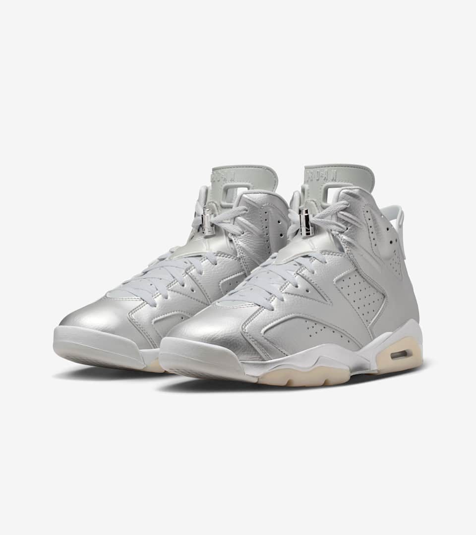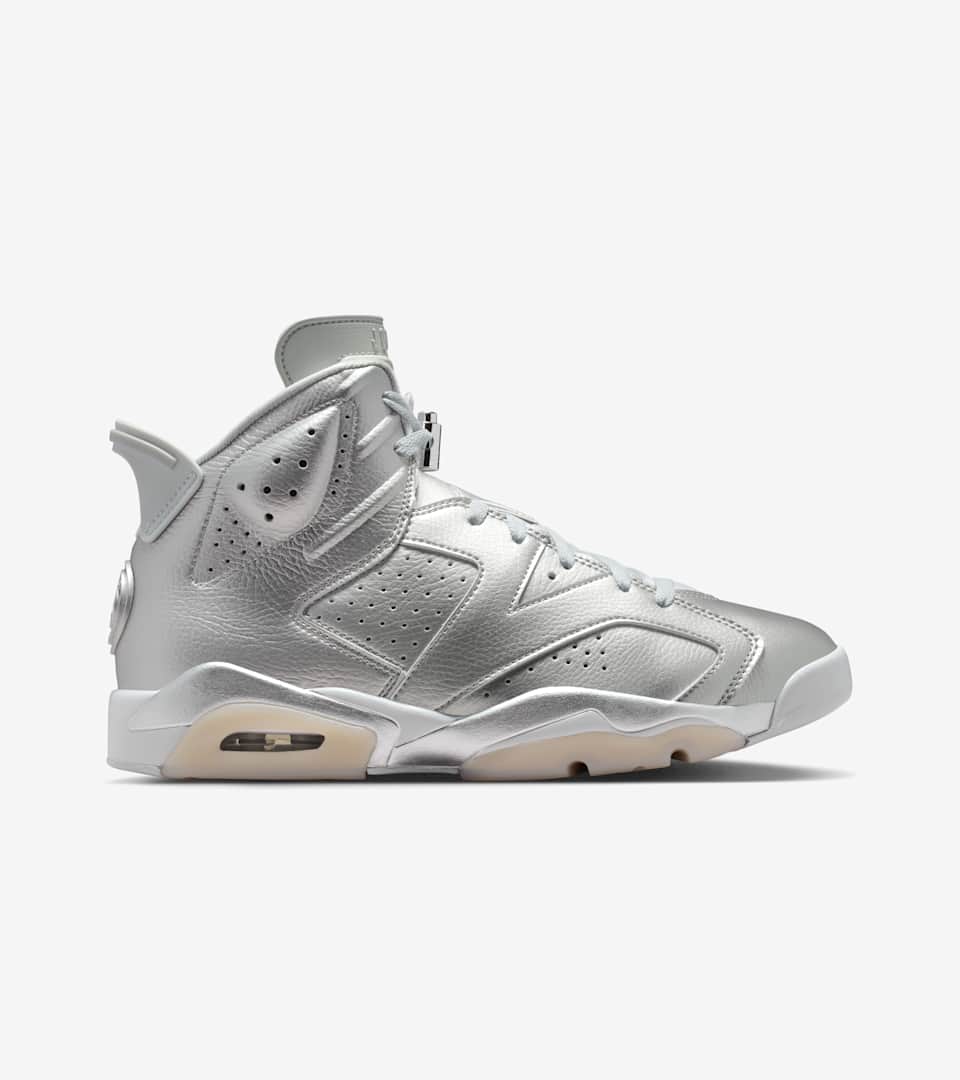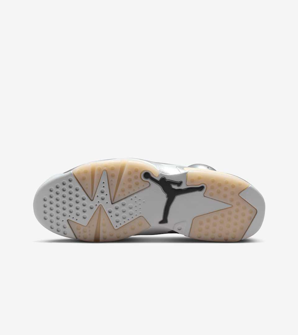 Two greats. One shoe. The AJ6 x PSG delivers Jumpman boldness and Parisian flair, repping legends on both the court and the pitch. A flashy Metallic Silver upper with perforated underlays adds a futuristic touch while highlighting the distinct design lines of Tinker Hatfield's 1991 masterpiece. A Pure Platinum outsole and glossy lace locks put some shine on this polished rendition. Air Jordan x PSG co-branding honors the partnership.