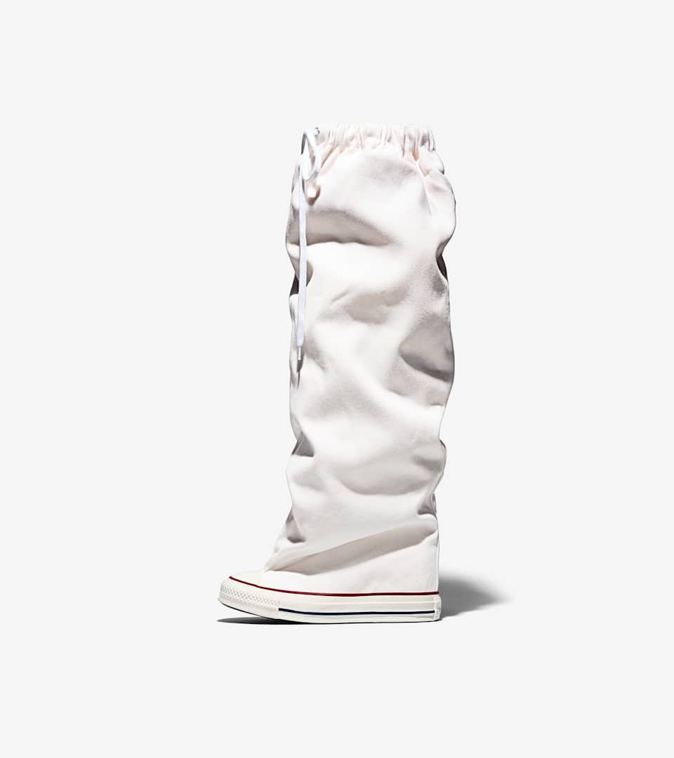 A collision of icons brings the rebellious spirit of Vaquera and Cortisa Star to Converse style. A knee high waxed canvas upper and Chelsea wedge insole give the All Star look a provocative new stance—a little baggy and oversized with a top lace and elastic webbing for style versatility. Lace up a bold new statement piece with the Chuck Taylor All Star XXXHi Slouch Wedge from Vaquera.