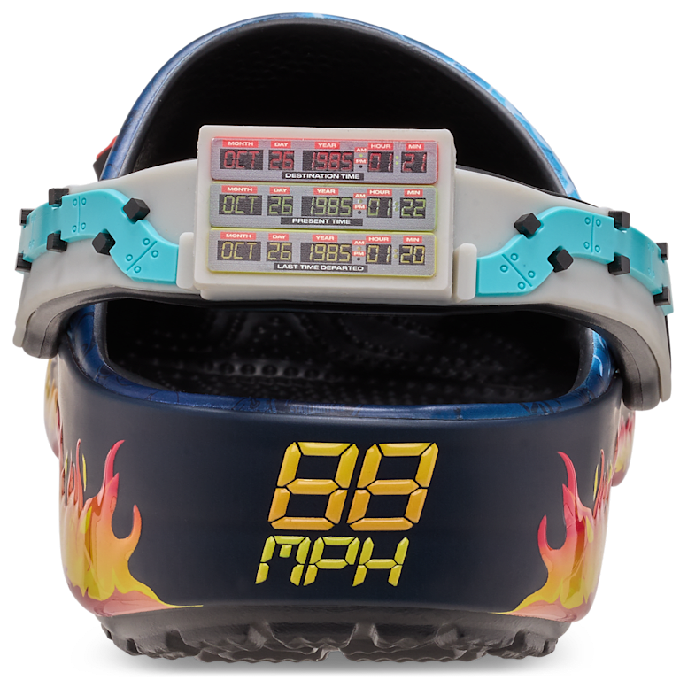 Celebrate the 40th Anniversary of Back to the Future in style! These nostalgic Classic Clogs feature time-splitting lightning bolts and flame-covered outsoles, decked out with Back to the Future inspired Jibbitz™ charms. The backstrap is equipped with the iconic Time Circuit and Flux Capacitor* seen on the back of the Time Machine. You’ll want to grab these timeless classics before the clock runs out. *Time travel not guaranteed.